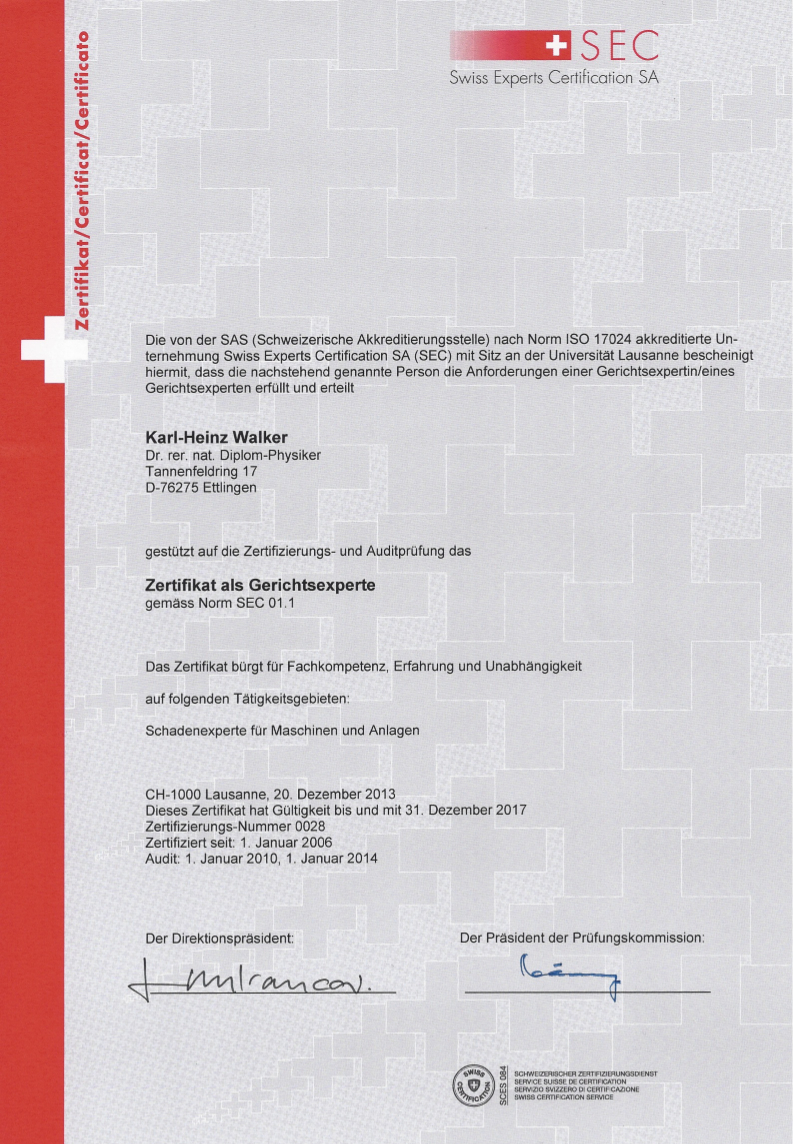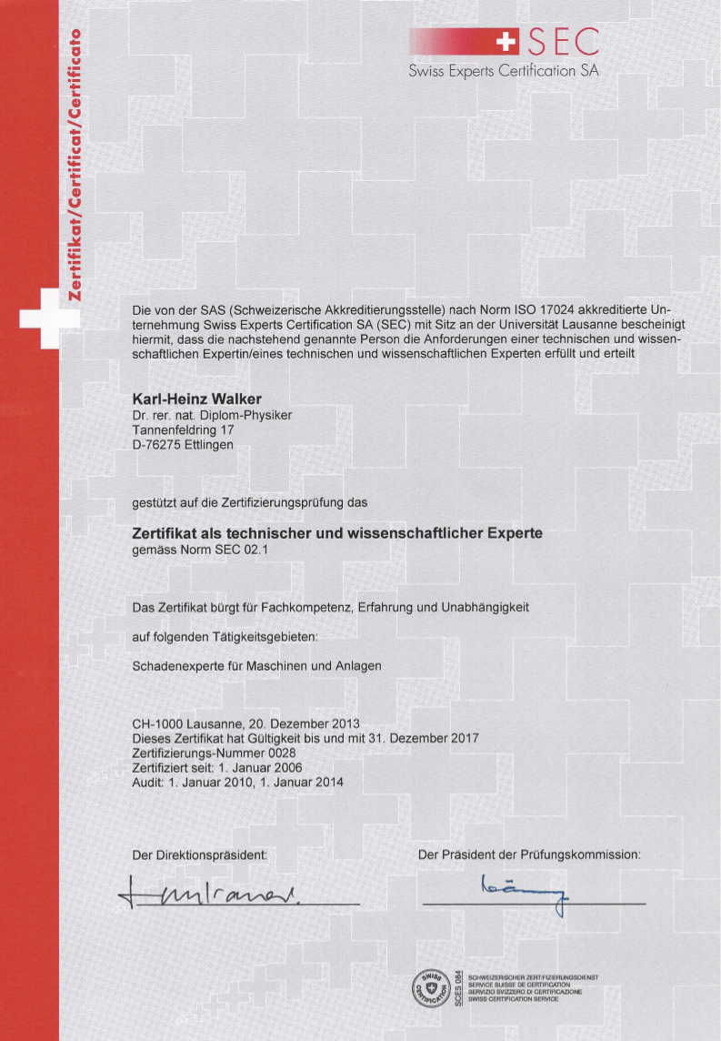 Ă–ffentlich bestellt und vereidigt fĂĽr "Physikalische Schaden- und Fehleranalyse von Maschinen und Anlagen, Mess- und Sensortechnik" durch die IHK Karlsruhe.