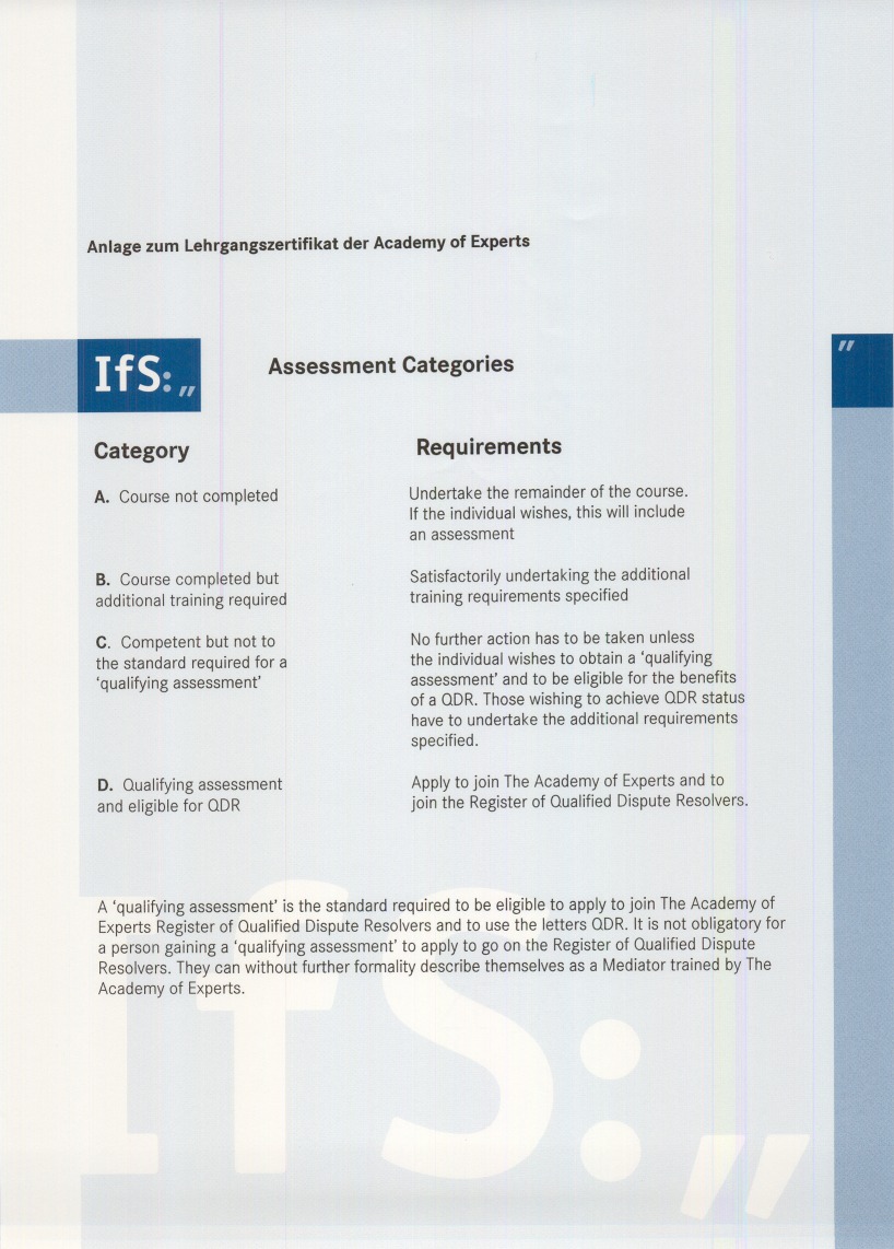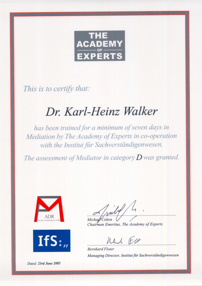 International zertifizierter Mediator, Qualified Distribute Resolver, Acadamy of Experts, London